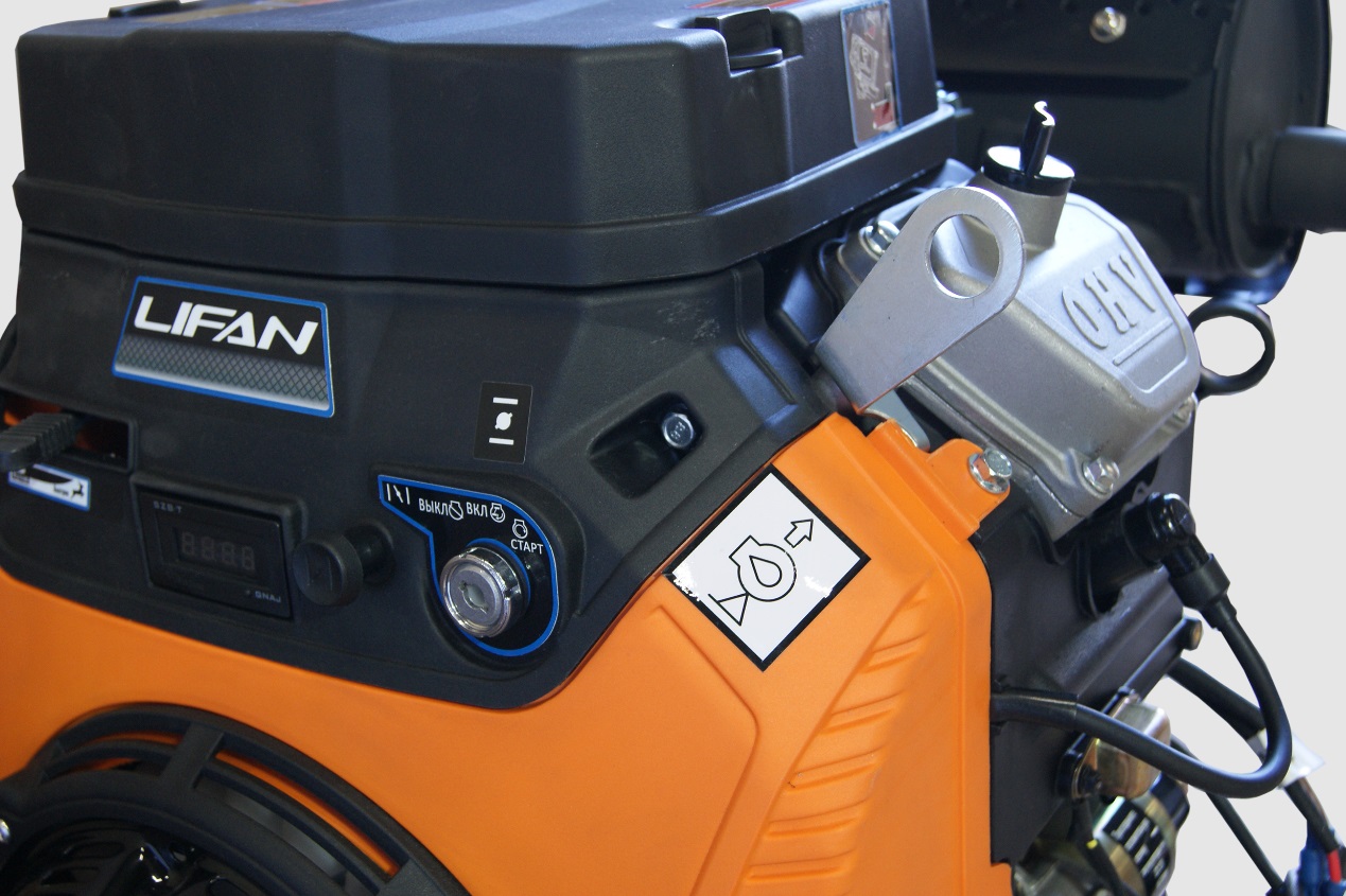 Lifan 2V80F-A (20A) бензиновый четырехтактный двухцилиндровый двигатель внутреннего сгорания. Рабочий объем составляет 744 кубических сантиметров. Гильза цилиндра изготовлена из чугуна, что существенно увеличивает срок службы двигателя и оснащённого им агрегата. Коленчатый вал имеет горизонтальное расположение, это также способствует небольшим размерам, а кроме того существенно упрощает конструкцию и монтаж силового агрегата на шасси.