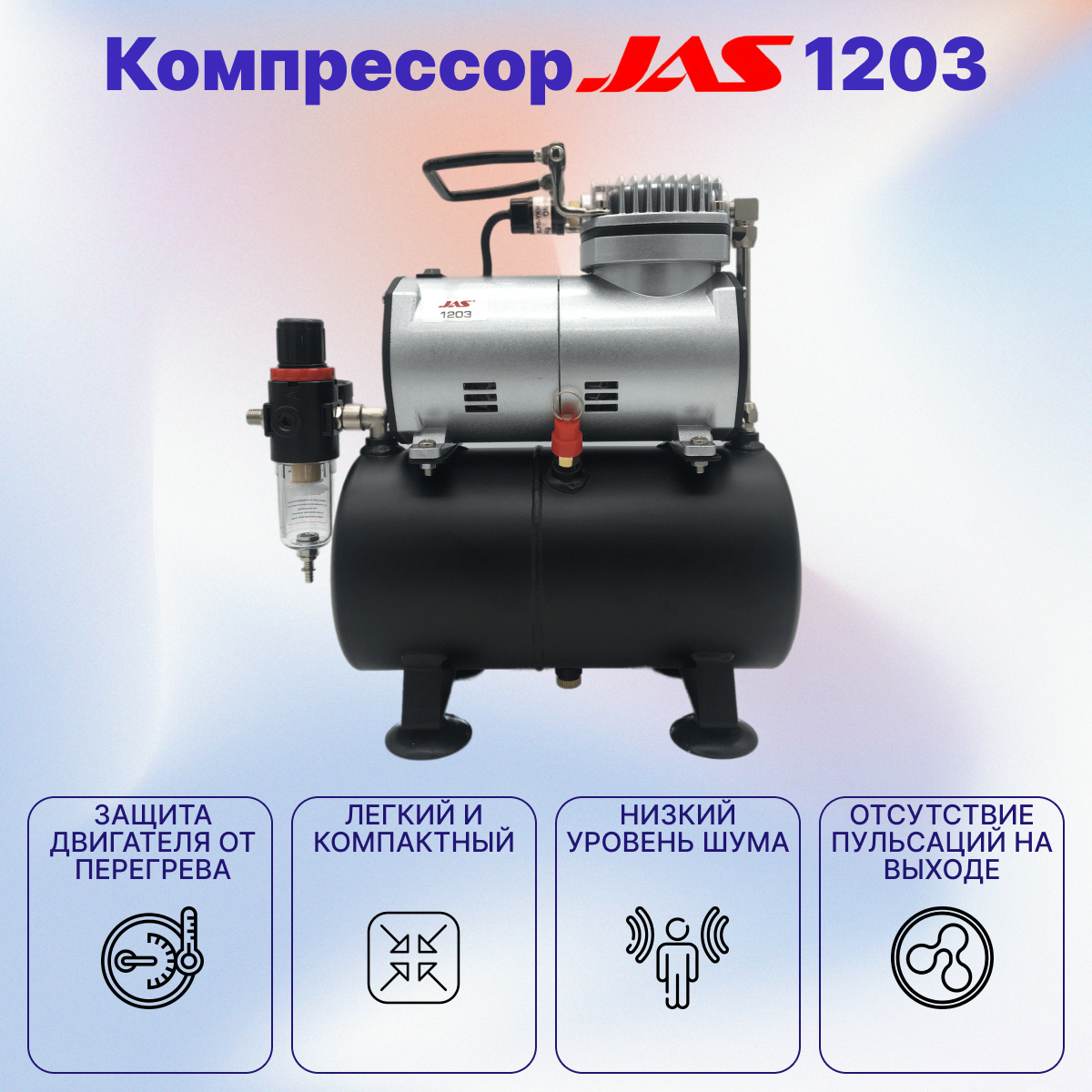 Легкий и компактный компрессор JAS 1203 предназначен для работы с аэрографом. Имеет возможность регулировки давления и автоматический регулятор давления, выключающий компрессор, когда его не используют. Рабочее давление стабилизируется ресивером. Поддерживает работу всех видов аэрографов с соплами любых диаметров. Применяется для моделирования, рисования, кондитерского производства, дизайна тканей, восстановления кожаных изделий, боди-арта, косметологии и так далее.
