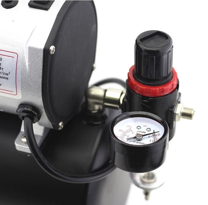 На компрессор установлен фильтр для очистки воздуха от пыли и влагоотделитель. Давление на выходе регулируется в диапазоне от 0 до 4 атм.