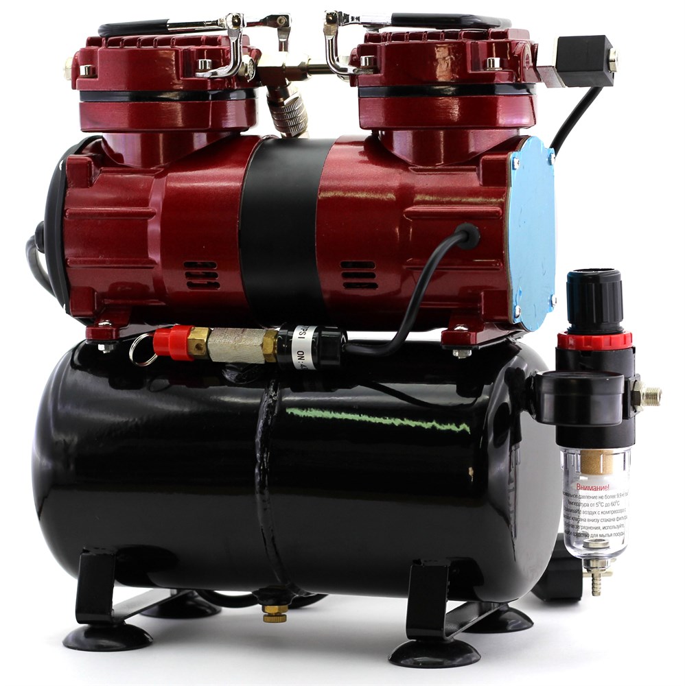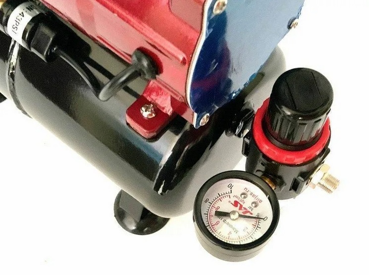На выходе из компрессора установлен механический регулятор, при помощи которого можно выставить необходимое давление для работы с аэрографом. Данным действием вы не только оптимизируете работу аэрографа, но и избавите сам аэрограф и шланг от избыточного давления, создаваемого компрессором. Тем самым продлите срок службы данному инструменту.