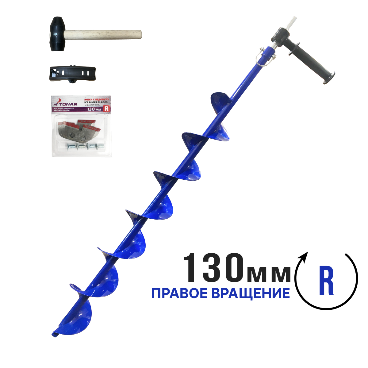 Шнек для ледобура правого вращения Патриот 130 мм комплектуется адаптером с подшипником, ступенчатыми ножами Тонар, также в комплекте поставляется футляр для ножей и резиновый молоточек, чтобы сбивать лед.