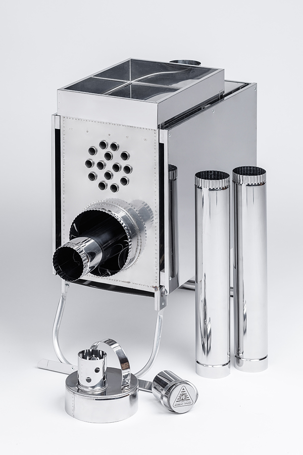 В печь-камин «ИНВЕНТ» с теплообменником вмонтирован, что просто необходимо при использовании печки в палатке, искрогаситель еще и способствует увеличению КПД, так как жар не «вылетает в трубу» напрямую. В то же время искрогаситель служит дополнительным ребром жесткости в верхней части печи. Благодаря ему, варочная поверхность нагревается быстро и равномерно по всей площади. Между искрогасителем и варочной поверхность внутри печи вмонтирован П-образный сегмент, который усиливает верх печи и при закладке камней, она не будет проминаться. Печь полностью выполнена из жаропрочной нержавеющей стали 0,8 мм. марки AISI 430 что в разы увеличивает срок ее службы (гарантия от сквозного прогорания 5 лет), а так же повышает устойчивость к механическим и температурным воздействиям.