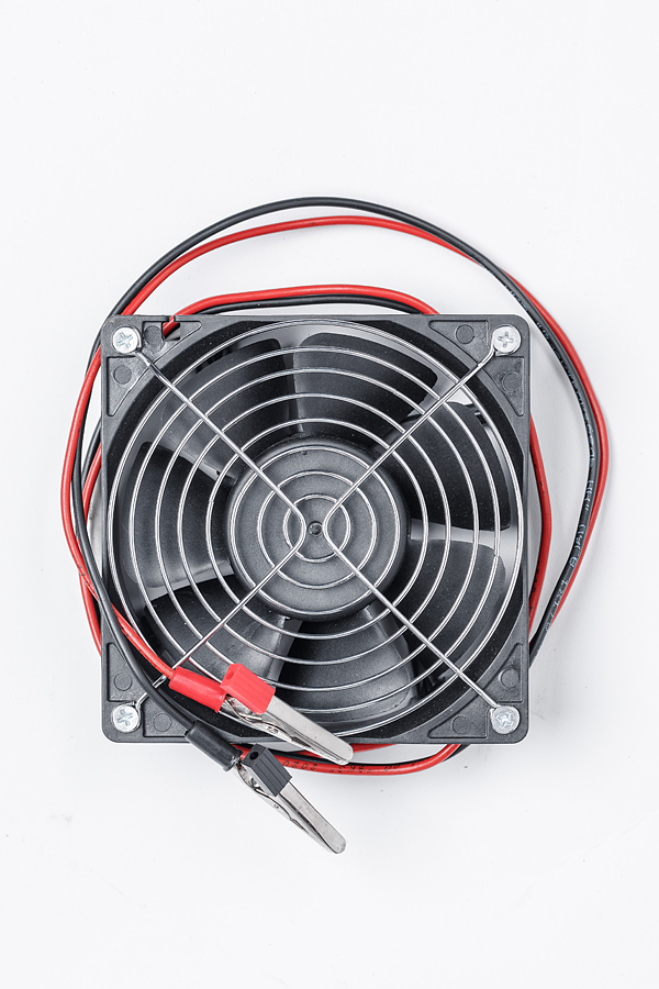 Принудительная циркуляция нагретого воздуха осуществляется за счет установленного в теплообменник съемного вентилятора, который питается от 12В (можно пользоваться автомобильным АКБ емкостью от 7 ампер-часов). Потребляемый ток вентилятора составляет 0,26 А/час.