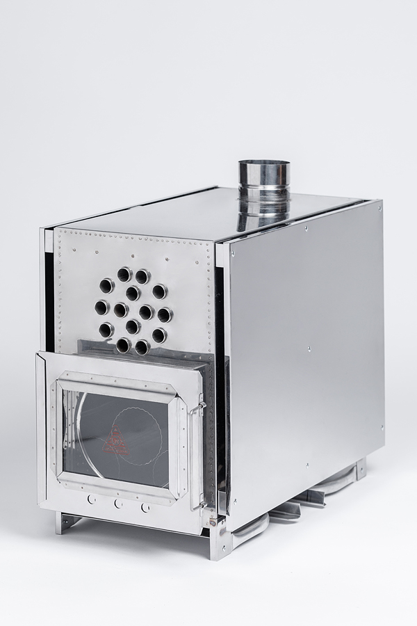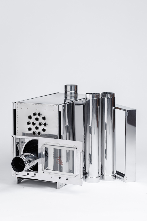 В печь-камин «ИНВЕНТ» с теплообменником вмонтирован, что просто необходимо при использовании печки в палатке, искрогаситель еще и способствует увеличению КПД, так как жар не «вылетает в трубу» напрямую. В то же время искрогаситель служит дополнительным ребром жесткости в верхней части печи. Благодаря ему, варочная поверхность нагревается быстро и равномерно по всей площади. Между искрогасителем и варочной поверхность внутри печи вмонтирован П-образный сегмент, который усиливает верх печи и при закладке камней, она не будет проминаться. Печь полностью выполнена из жаропрочной нержавеющей стали 0,8 мм. марки AISI 430 что в разы увеличивает срок ее службы (гарантия от сквозного прогорания 5 лет), а так же повышает устойчивость к механическим и температурным воздействиям.