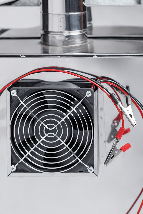 Принудительная циркуляция нагретого воздуха осуществляется за счет установленного в теплообменник съемного вентилятора, который питается от 12В (можно пользоваться автомобильным АКБ емкостью от 7 ампер-часов). Потребляемый ток вентилятора составляет 0,26 А/час.