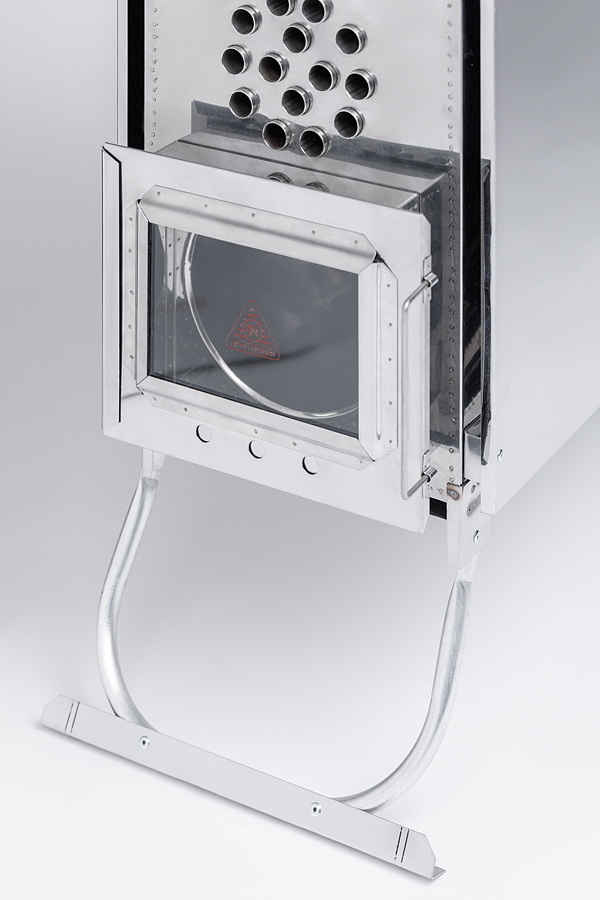 Топочное отверстие имеет дверцу с ручкой в виде слайдерной крышки с термостойким стеклом и отверстиями для регулировки тяги.