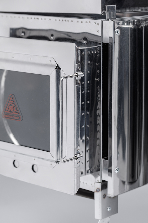 Топочное отверстие имеет дверцу с ручкой в виде слайдерной крышки с термостойким стеклом и отверстиями для регулировки тяги.