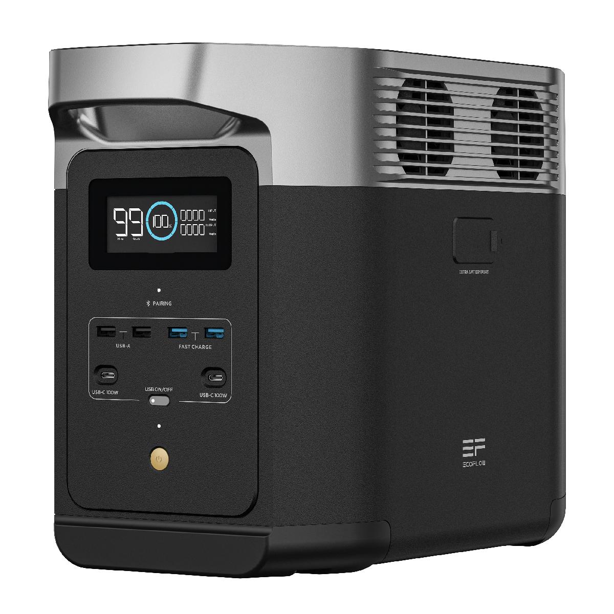 Портативная зарядная электростанция EcoFlow DELTA 2 с расширяемой емкостью 1–3 кВт⋅ч (за счет дополнительной батареи, приобретаемой отдельно или в специальном комплекте).